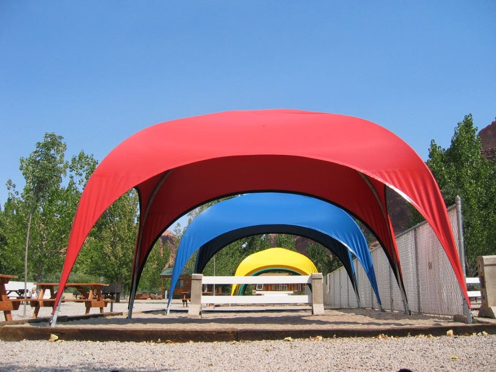 The frame system of our canopy structures are made using high-strength galvanized steel or lightweight and aircraft-grade aluminum. Optional powder-coating is available if you intend to use your canopy structure in coastal environments where sea spray or salt air is present. We offer tan and gray as standard powder-coating colors. Specialty colors (black, white, red, and blue) may be available, for an additional cost.