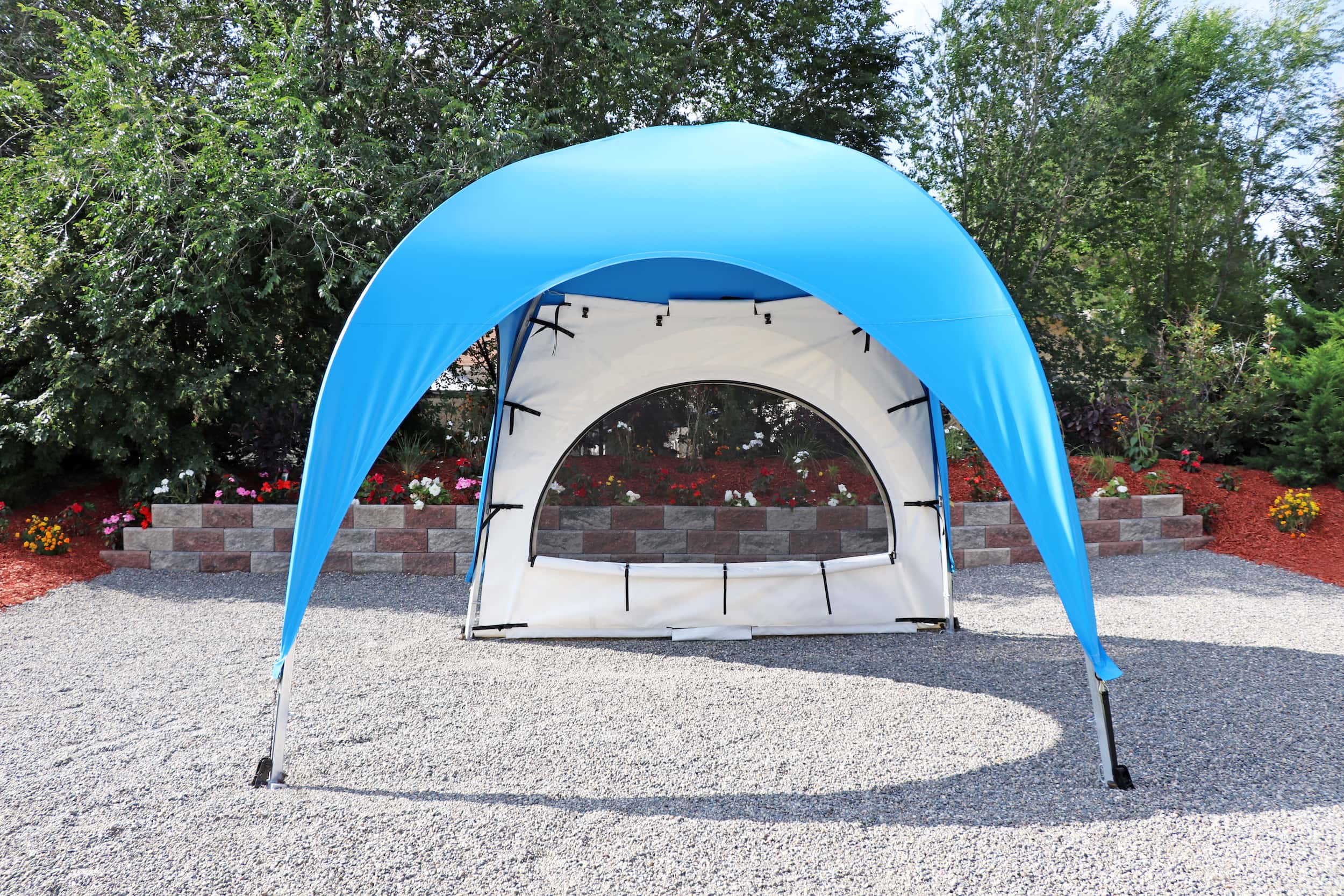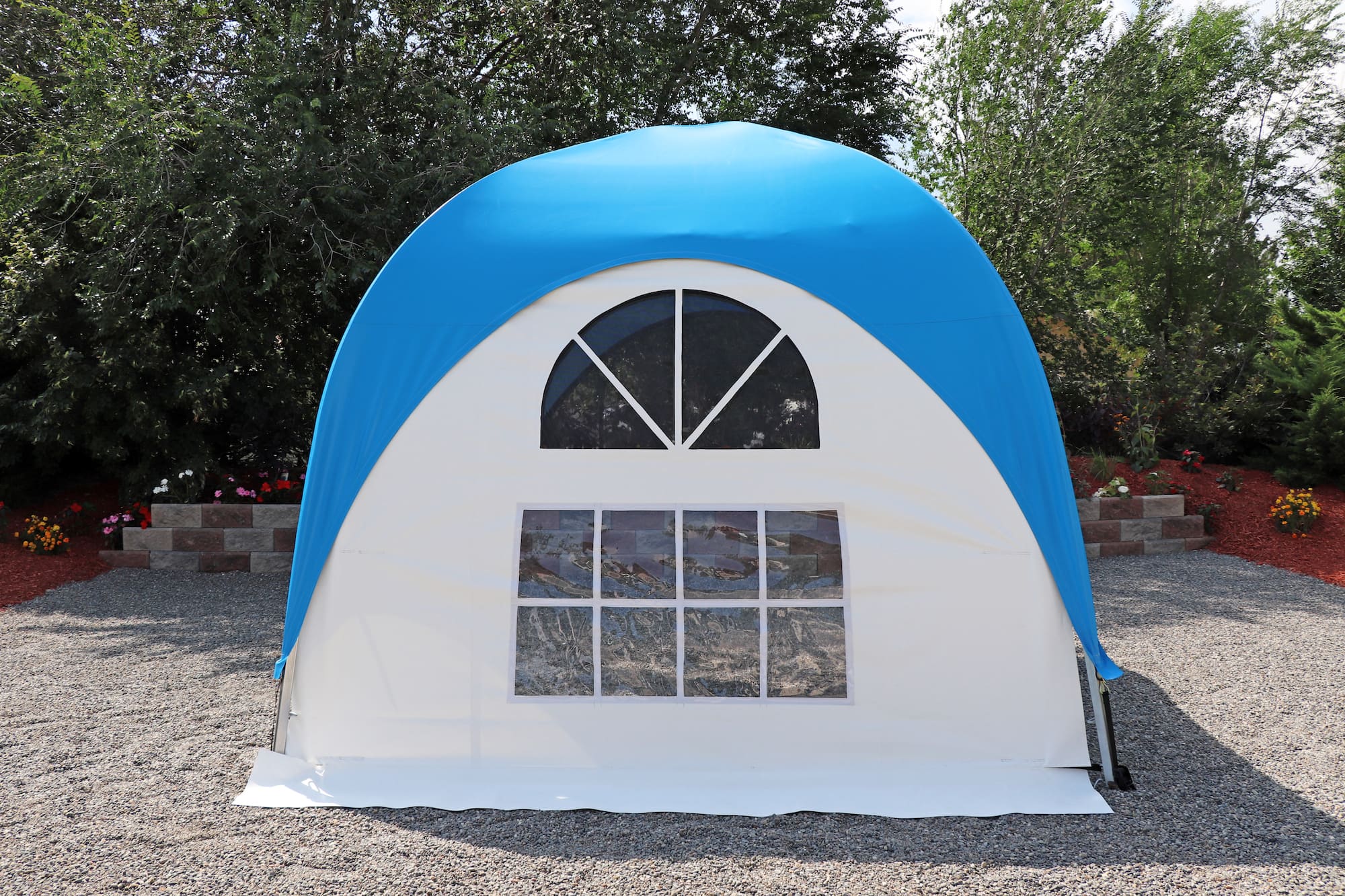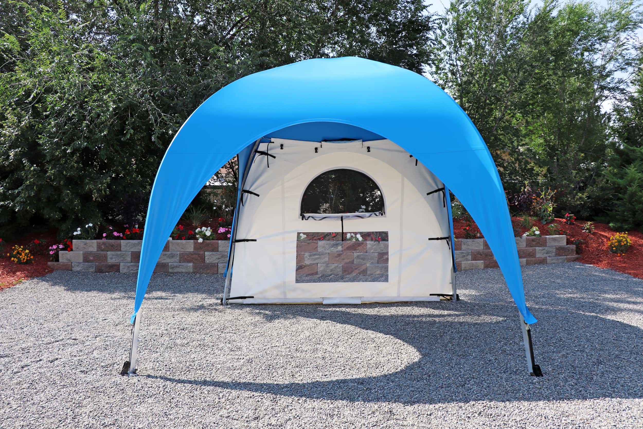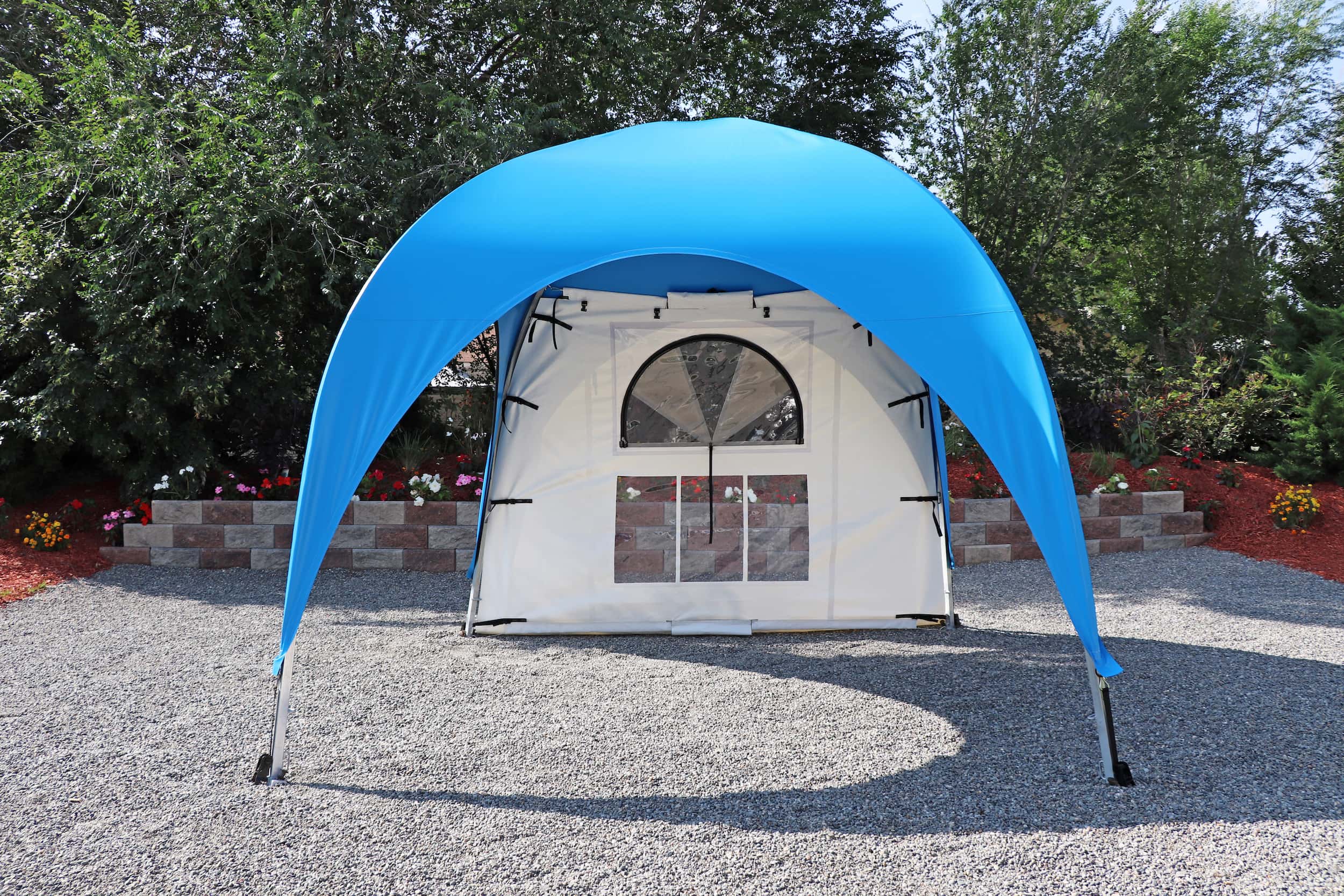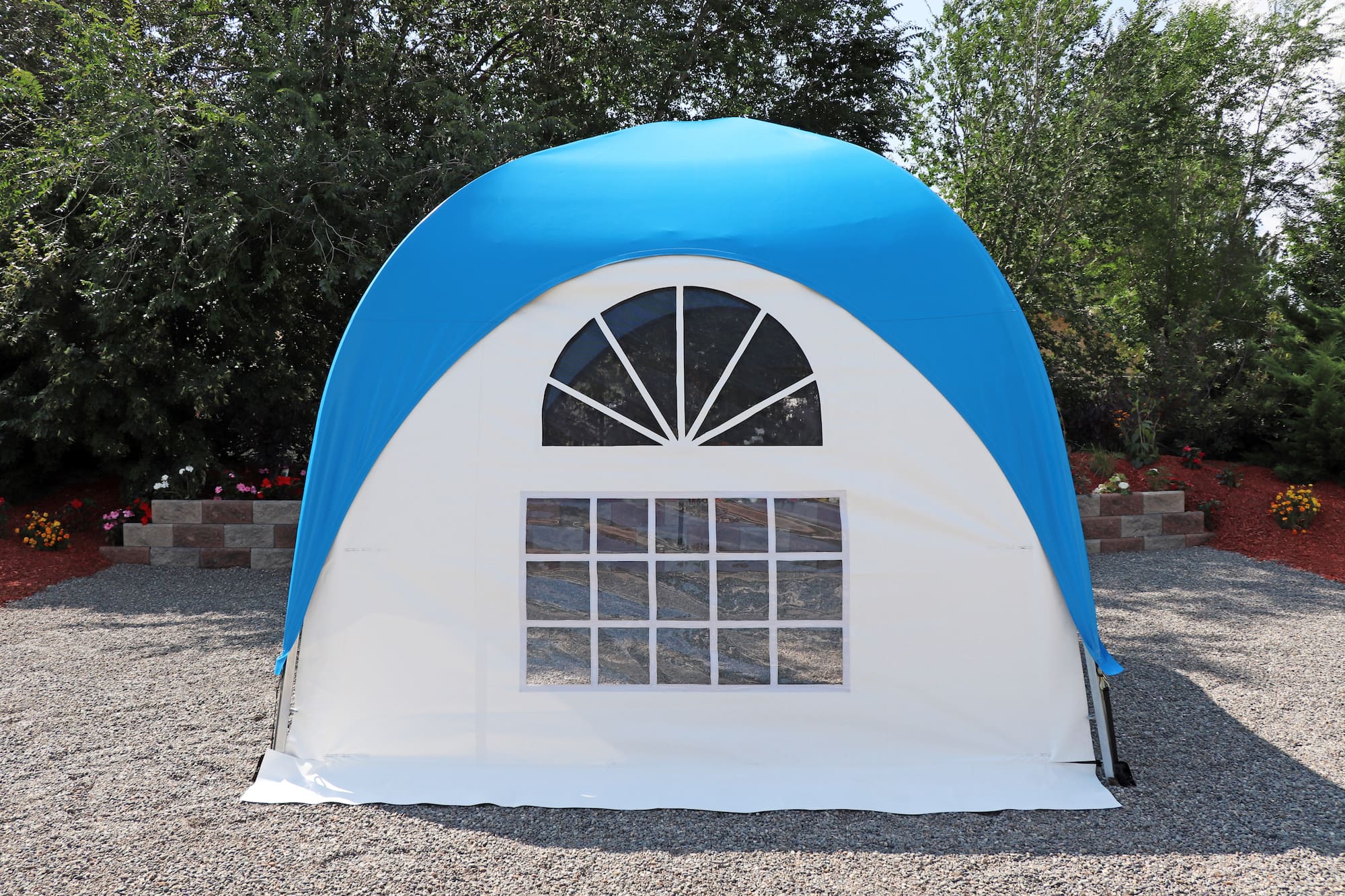 Inspired by the timeless elegance of old French architecture. This side curtain features a stylish transom with a semi-circular “Sunburst” design, reminiscent of the classic French buildings of Paris, where large windows are artfully divided into smaller panes for a touch of sophistication and charm. The semi-circular window is adorned with a screen mesh and a zippered clear-plastic cover. Elevate your WeatherPort® Canopy or outdoor event structure with a touch of Parisian flair and understated luxury.