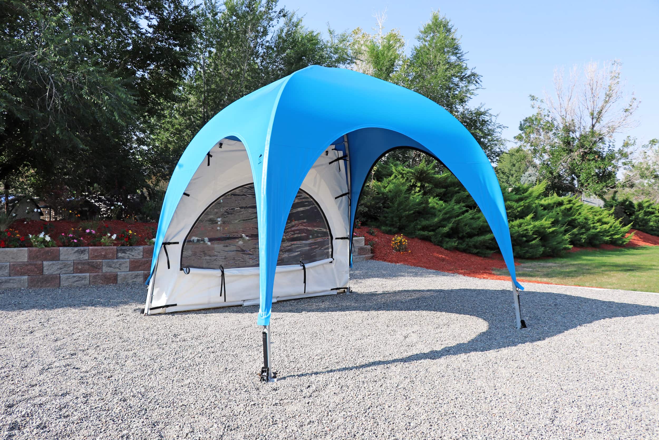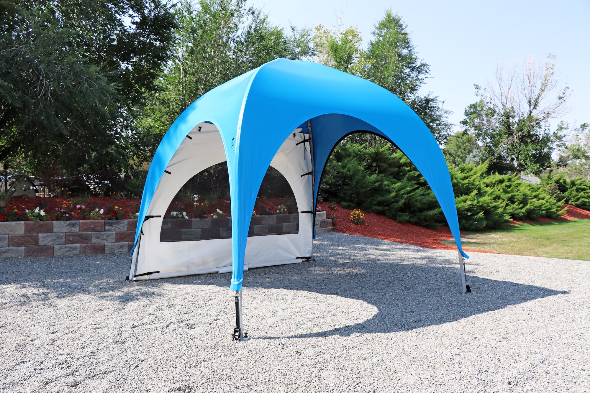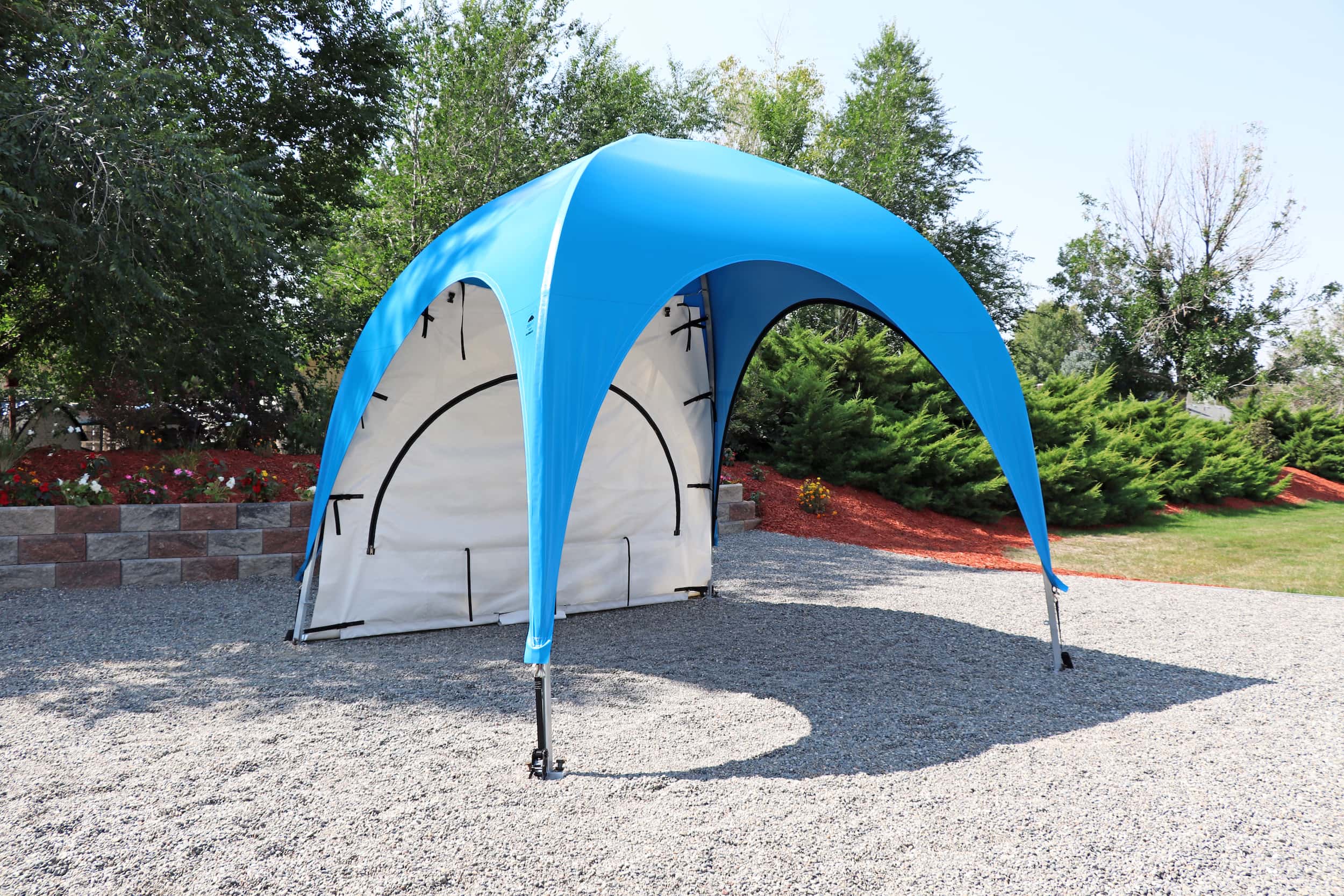 Fast and easy access to your WeatherPort® canopy or event structure. Access your canopy or event structure quickly, especially when other sides feature different curtain options. The double, heavy-duty zipper allows for quick and secure entry, with alligator clips at the top for effortless rolling and securing of the door panel. For additional comfort, consider adding a screen mesh door to maintain ventilation, sightlines, and an enhanced outdoor experience. In the face of changing weather conditions, simply close the door to enjoy the protected space provided by your WeatherPort® canopy or event structure.