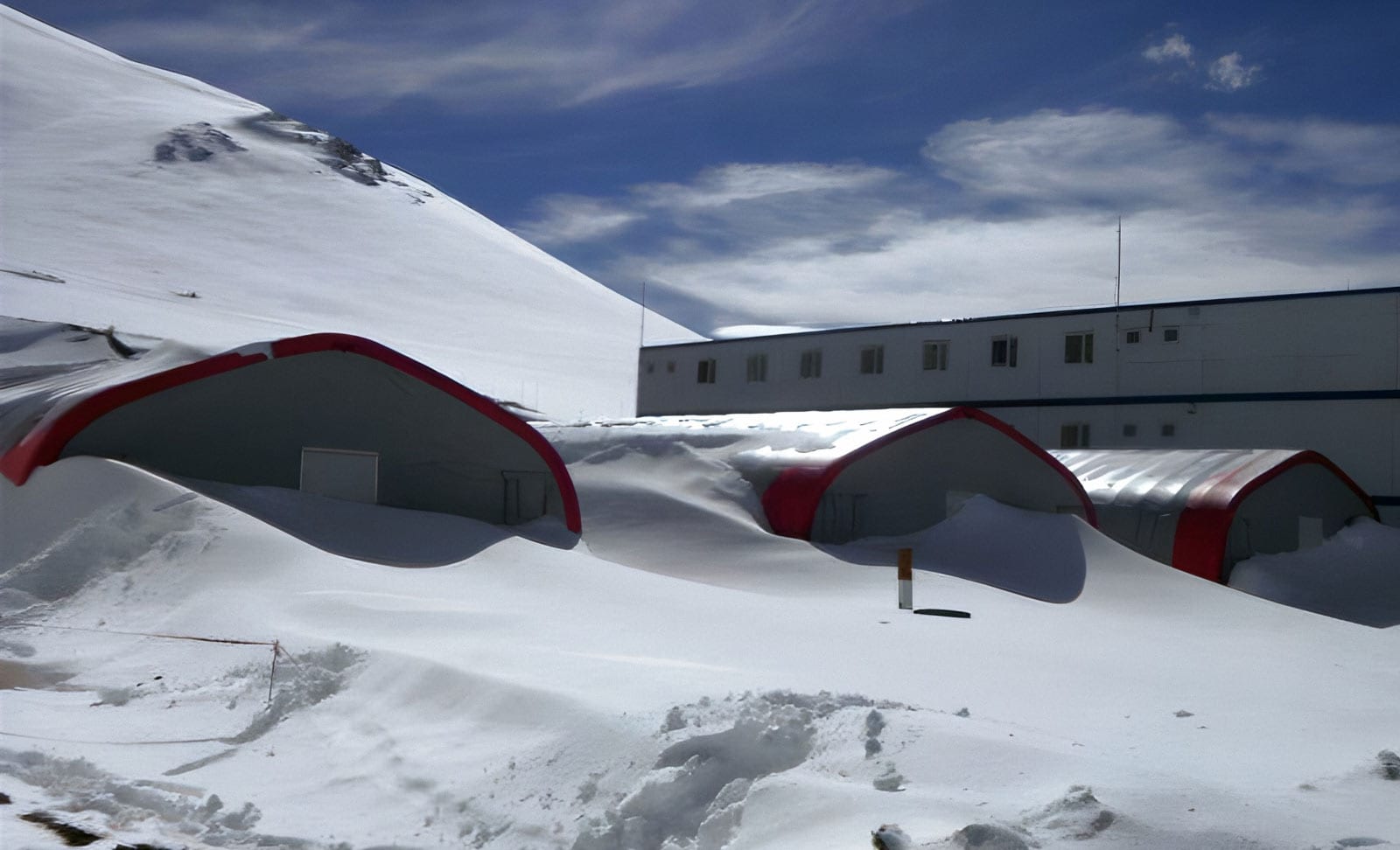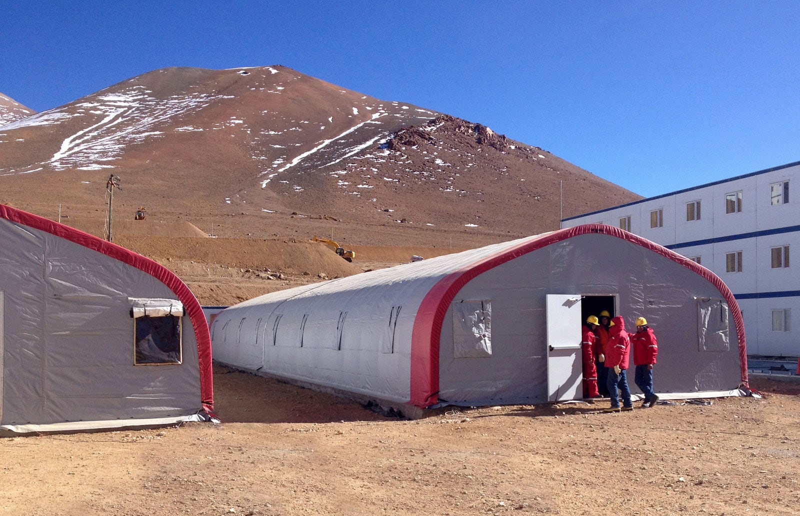Alaska Structures® was selected to provide a large-scale construction camp to support the development of a high-altitude gold mining operation located in the Andes Mountains of Chile. Situated at elevations exceeding 14,700 feet, the project environment presented extreme challenges, including sustained winds up to 100 MPH, snow loads exceeding 65 PSF, intense UV exposure due to high solar load, and significant temperature fluctuations.